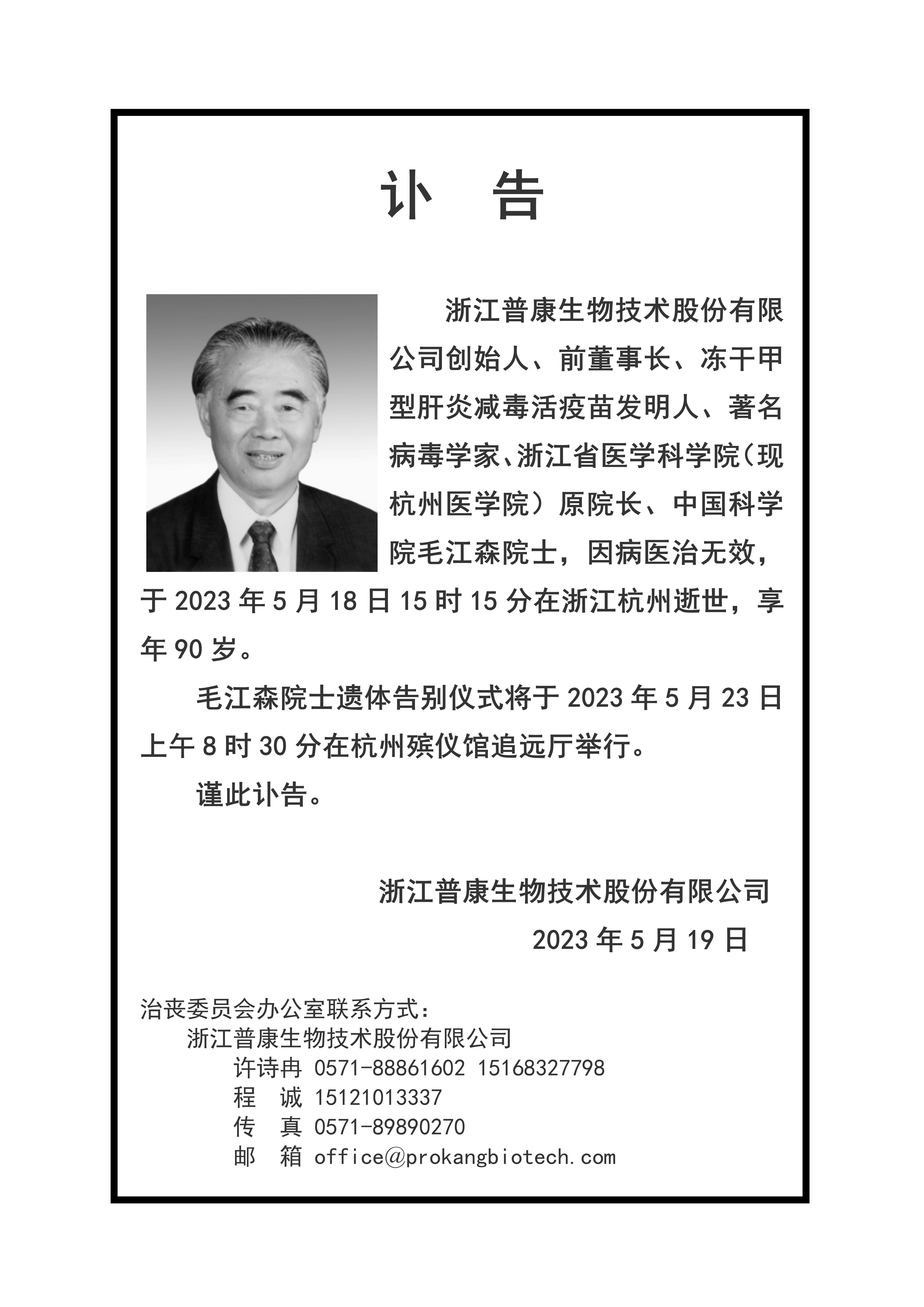 沉痛悼念并深切缅怀公司创始人毛江森院士