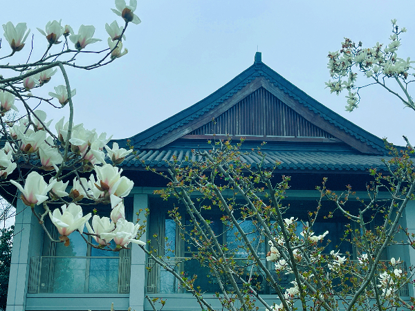 接着我们来到了著名的杨公堤,这个时节的杨公堤上,沐着丝丝凉意的微风,呼吸着清新的空气,时不时出现一两棵桃树、樱花、垂丝海棠,会让人情不自禁的展开笑意。在杨公堤行走约一两公里,我们到达了今天中午就餐的西湖国宾馆。宾馆位于西湖的核心,被誉为“西湖里的西湖”。庭院内建筑精巧、曲廊修竹、古木奇石、一步一景。让大家都很期待的西湖国宾馆百年玉兰花王开了!玉兰花伫立西子湖畔,肆意绽放,美得傲骨,淡雅又迷人。春风拂面,馥郁花香随风而来。