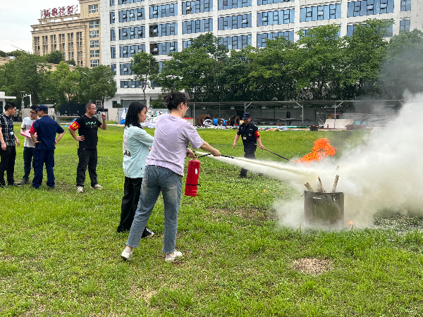 演习结束后,安保人员现场讲解灭火器的使用方法并作演示,员工们积极参与灭火器的实战操作。