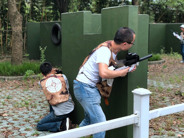 走过草坪,穿过一条铁索木板桥,大家来到了最期待的活动——真人CS大战。教练把大家分为蓝黄两队,在简短地介绍完规则之后,游戏便开始了。两队在场地中间的位置交锋,顿时水弹横飞,双方各有队员中弹,战况混杂,已不知击中自己的是对手还是队友。稍作调整后,双方队员各有战略:有防守,有冲锋,有偷袭,还有补充弹药的增援兵,打得有模有样。场上两队不分伯仲,各个大汗淋漓,很是畅快!